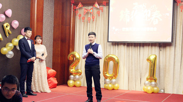 年會晚會現(xiàn)場充滿激情、熱烈、活躍的氣氛。首先,由公司總經(jīng)理何飛君致辭,何總說:“在過去的一年,感謝歐美家人的付出,2017年歐美完成了多項改革,擴大了團隊規(guī)模;提升了企業(yè)形象,可以說2017年為我們?nèi)蘸蟮陌l(fā)展打好了堅實的基礎(chǔ)。所以在2018年的工作中希望我們都可以拿出激情與干勁,為我們的美好未來而奮斗” !